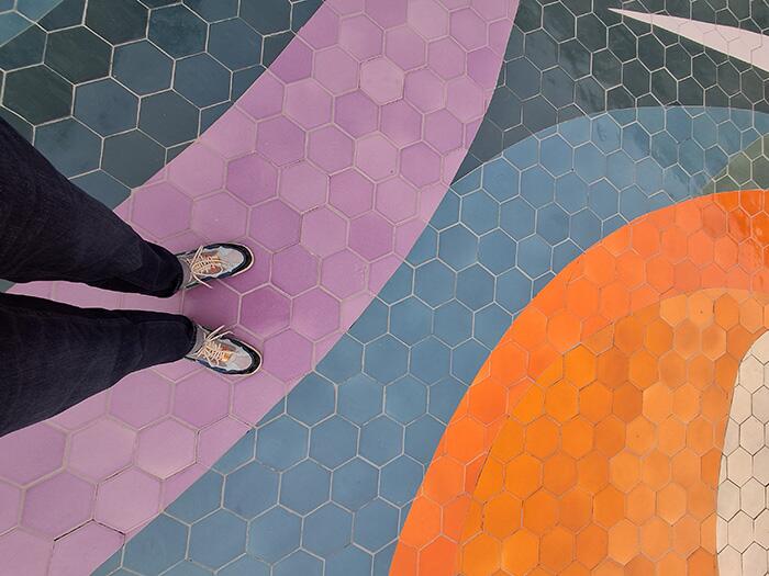 En un espacio central, la aclamada artista brasileña Marina Pérez Simão -en colaboración con el uzbeco Bakhtiyar Babamuradov- intervino un patio con una obra cerámica abstracta donde crea un paisaje utilizando colores vibrantes y formas fluidas para evocar la serenidad, el misterio y la belleza de la naturaleza, inspirándose siempre en la literatura, la filosofía y sus experiencias personales. Una obra que además de la contemplación invitaba a habitarla creando un singular territorio personal y colectivo.