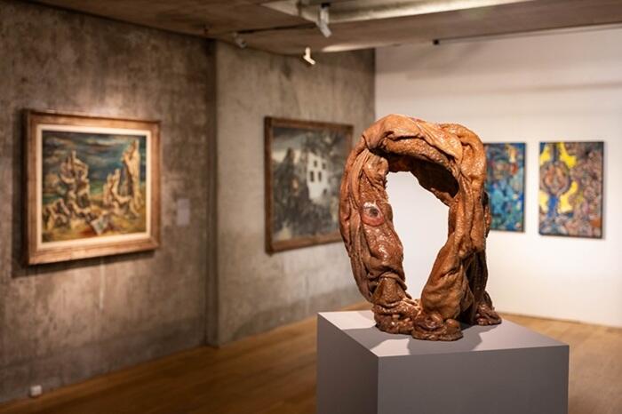 Concluyen el recorrido otros dos núcleos que conviven en el segundo subsuelo. Ellos son Mundo cruel y Deseo y abyección. El primero tiene un carácter político ya que se remonta a la histórica posición antifascista del surrealismo. En referencia a la Argentina, la exposición puntualiza tres momentos: la década del 40, la del 70 y el presente. Aquí se exhibe la pieza más antigua de todas como es Del odio y la malicia (1940), de Mariette Lydis, una exiliada de origen austríaco que se radicó en Buenos Aires. En ella se aprecia un escenario de devastación luego de un bombardeo en el cual los personajes llevan la atmósfera de pesadilla a un nivel entre trágico y ominoso. Participando de este contexto, Raquel Forner se hace presente con La conferencia (1947), una pintura inmediatamente posterior a la II Guerra Mundial. En 1978, a poco de iniciarse la última dictadura cívico-militar. Silvia Brewda, presentó Las ataduras, una serie de dibujos en los cuales trabaja con sogas, telas y torsiones para reimaginar el cuerpo y el espacio. La artista describió la serie como surgida de un imperativo interior que daba cuenta de la época. Del mismo período se hallan obras de Lucía Pacenza y Josefina Auslender. En referencia al presente La construcción de un milagro (2025), óleo de Verónica Gómez, dialoga en forma adecuada con las escenas de destrucción y atmósferas metafísicas de sus antecesoras, mientras que la ironía y cierto caos se despliegan en las pinturas de Laura Codega. Participan en este núcleo, además, piezas de Florencia Marrapodi, Lola Orge Benech y Mónica Heller.