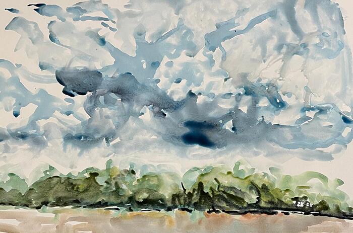 Nada se fija del todo: la acuarela es una forma de estar de paso. El celeste se disuelve en el polvo, los ocres flotan sobre la distancia, una línea apenas sugiere la presencia de un monte lejano. Los colores no describen: insinúan. Se mueven como la memoria, mezclan cielo con tierra, agua con aire, hasta que el paisaje deja de ser un lugar y se vuelve una emoción que respira.