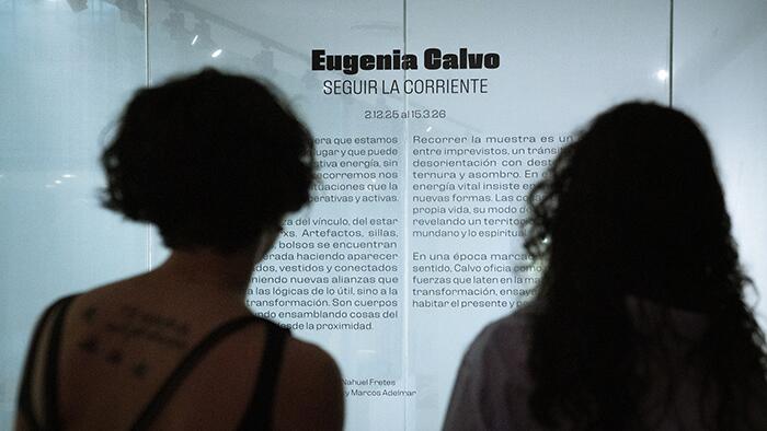 Seguir la corriente no es la primera oportunidad en que la artista genera situaciones desconcertantes a partir de elementos considerados habituales en la vida diaria. En otras instalaciones anteriores, por mencionar algunas recientes, como Dormir vestida (2022) o Hecha para siempre (2021), los artefactos de uso doméstico fueron también los protagonistas, de igual suerte desfuncionalizados y expuestos a otros sistemas de relaciones entre sí y con el espacio que los albergaba. En ambas primaba un orden rígido, minucioso, contenido. En el presente trabajo estas últimas coordenadas se alteran radicalmente. Para el curador, Sebastián Vidal Mackinson las nuevas operaciones puestas en práctica por Calvo hacen que esta exhibición pueda considerarse como una bisagra en su trayectoria e ilustra este dato en el texto curatorial con las siguientes palabras: El uso de flejes de hierro con los que Calvo solía estructurar sus escenas, que aprisionaban el mobiliario al mismo tiempo que se proyectaban de manera clara y definida en el espacio, se desvanecieron. La tensión dada por la fijación extrema a la que estaban sometidas las piezas, tratadas como si tuvieran la posibilidad de revelarse, se relajó. Lo que queda en suspenso y sujeto a verificación es si lo que se interpreta como un punto de inflexión irá a consolidarse como una necesaria y auténtica expresión de cambio o si se quedará en un gesto que se agote en sí mismo. Aquí cabría desear aquello que alguna vez enunció Franz Kafka: "A partir de cierto punto no hay retorno. Ese es el punto que hay que alcanzar".
