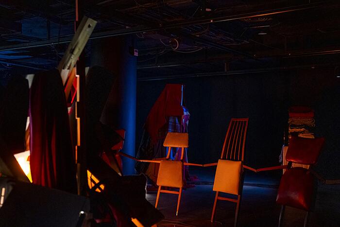 Apelar a la subversión de los dictados utilitarios habla de perspectivas que se deshacen en su propia fragilidad. Donde antes había certezas ahora hay ruinas dislocadas y re territorializadas. Materiales nobles asociados a viejos oficios, sintéticos industriales y dispositivos tecnológicos que oscilan entre lo cálido y lo glaciar forman parte del mismo paisaje. Sus propias entrañas irradian sentidos. ¿Se está frente a un escenario de simples escombros o ante los restos de una civilización? La incertidumbre se ha apoderado de cada rincón. Presente, porvenir y pasado mítico se entremezclan. Una figura que podría representar un tótem guarda rasgos antropomórficos; se adivina su cuerpo cubierto por lo que serían sus vestimentas en la contundencia geométrica de una heladera; su rostro es el recinto encendido de un horno de microondas. Se puede imaginar que observa otra pantalla o que también puede ser observado. Las figuras antropomórficas alcanzan su máxima manifestación en lo que podría denominarse una ronda de seres/cuerpos producidos con partes de sillas correspondientes a diseños no uniformes alrededor de algo que simula ser una fogata gracias a las tonalidades rojizas que emiten unas estufas de cuarzo. Hay una cadena asociativa animista puesta en juego allí. ¿Se trata de un rito o simplemente es una referencia a la búsqueda de calor por parte de existencias precarias expuestas a las catástrofes climáticas?