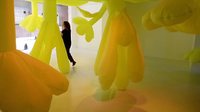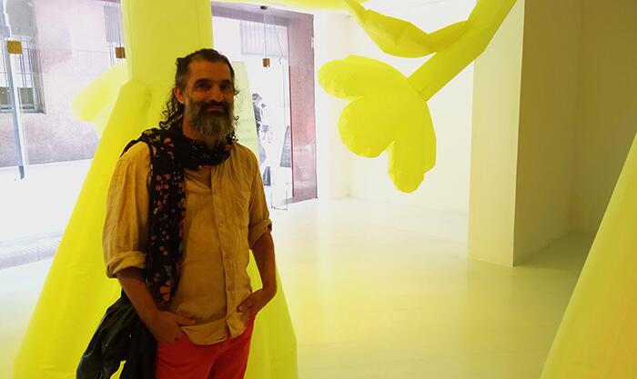 Las esculturas, enormes flores amarillas confeccionadas con nylon, suspendidas desde el techo tienen la capacidad de modificar el espacio que las aloja, determinan la forma de circularlo, envuelven a los espectadores no sólo por la contundencia de sus dimensiones sino por la calidez de sus formas y la irradiación de color que parte de la luz que se refleja en ellas. El conjunto conforma el simulacro del despliegue de lo orgánico que podría apreciarse a campo traviesa. Su contacto con el exterior, sólo intermediada por puertas de cristal, hace que el sol incida en ellas de manera cambiante durante el transcurrir del día y habilite la curiosidad de los transeúntes. De esta manera les desactiva a ellos, aunque sea circunstancialmente, sus rutinas diarias o sus preocupaciones laborales; les ofrece el beneficio de lo imprevisible. No obstante, este jardín sintético es un modelo que señala los límites o el reemplazo creciente de la experiencia sensible en la actual vida colectiva. Aún bellas, estas flores jamás serán visitadas por aves o insectos. En cambio, recogerán cientos de imágenes que se almacenarán en teléfonos móviles, en las nubes de memoria consumidoras de energía. En consecuencia, las referencias a la autorreferencialidad y el carácter espectacular resaltan aquello que hace desequilibrar la balanza: la artificialidad extendida y reproducida por el vendaval de imágenes en una época donde lo que se privilegia se encuentra en todo lo que acotan las pantallas.
