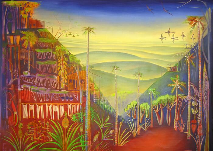 Anclada en la tradición del paisaje y del retrato, bajo el dominio de una “urgencia de registro”, en palabras de la artista, y con el color como disparador, su pintura nos enfrenta a imágenes que traen reminiscencias del arte popular e ingenuo, a la práctica del grabado, y a algunos códigos formales del arte prehispánico, y que pretenden dar cabida a cada uno de los ingredientes del tiempo y espacio transitado. El resultado es una producción independiente y profundamente poética, atenta a los accidentes y eventos que ofrece y se suceden en el territorio.